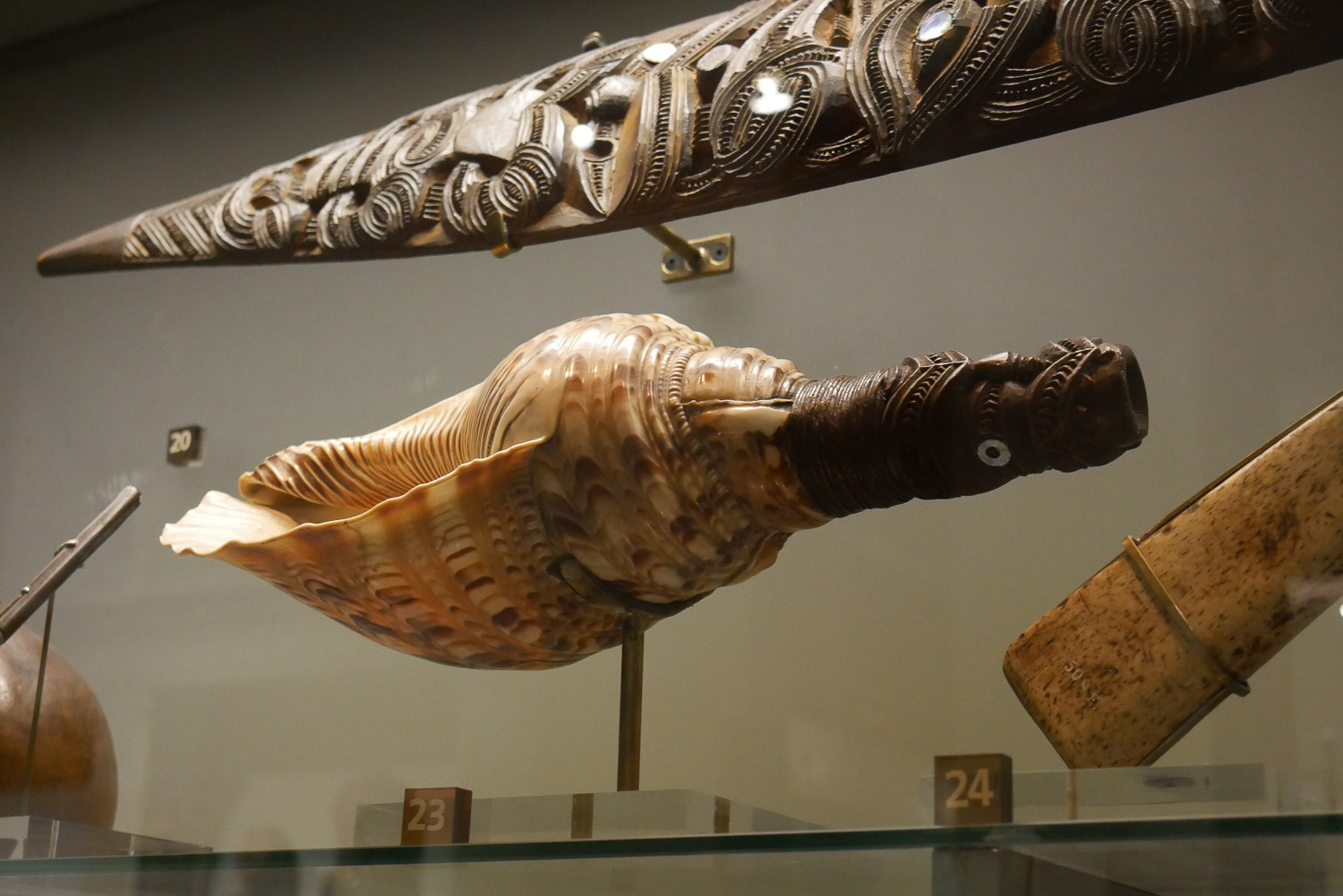 Ein ganzes Stockwerk ist den Maori und anderen Pazifischen Bewohner gewidmet. Die Maorikunst ist schon sehr beindruckend. Besonders ins Auge gefallen ist mir eine Muscheltrompete. Es würde mich interessieren wie so etwas klingt.