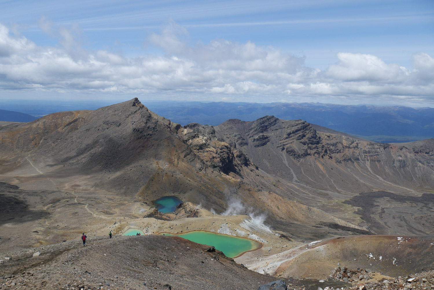 Die nächste Stunde ist dann wieder angenehm eben. Danach kommt dann wieder ein ordentlich steiles Stück zum Rand vom roten Krater. Dort kommt dann auch wieder deutlich mehr Wind, da man komplett ungeschützt ist. Als Nächstes kommen ein paar Schwefelseen in den man aber nicht Baden sollte und die auch ordentlich stinken. Den Tongariro Gipfel habe ich heute mal ausgelassen. Nach den Seen kommt dann auch bald schon der letzte Anstieg und danach geht es fast nur noch bergab. Irgendwann kommt dann noch eine Hütte und man vermisst sofort unsere bewirtschafteten Hütten. Jetzt ein kühles Bier wäre einfach das Beste. Am Ende hat es sich dann noch mal ordentlich gezogen und meine Füße haben angefangen wehzutun. Ich war dann doch ganz froh wieder an meinem Auto zu sein. Endlich mal eine gute Herausforderung. Anstatt Bier gab es dann halt nur ein kühles L&P am Parkplatz. Das war sogar relativ günstig. Ich hätte auch das Doppelte dafür bezahlt.