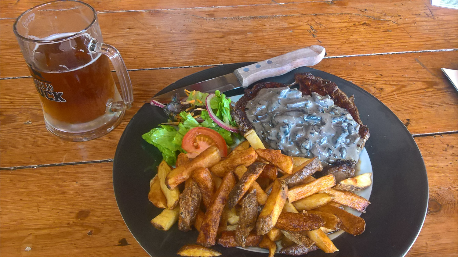 Ich bin dann zum Mt. Egmont Information Center gefahren um dort vor Ort noch mal Informationen über die Wanderung abzuholen. Aber wird morgen wohl wirklich eher nichts. Dafür wird es danach besseres Wetter und es sollte kein Problem sein die Wanderung zu machen. Ich bin dann zu einem Campingplatz in der Nähe gefahren. Im Restaurant hat man dort 20 % Rabatt bekommen und ich hab mir mal wieder nach langer Zeit ein ordentlich Steak und ein Bier gegönnt.