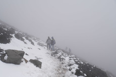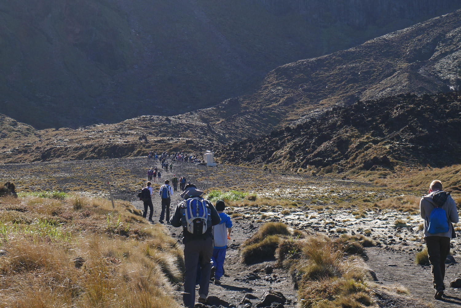 Am Start vom Crossing sieht man dann mal, wer so alles, mit welcher Ausrüstung losgeht. Mein Favorit waren Japaner, die schon vor dem loslaufen nach wärmeren Socken gefragt haben. Generell sind die meisten Leute erst mal mit allen Klamotten losgelaufen. Was wollen die armen Menschen machen, wenn es dann auf dem Berg so richtig kalt wird? Die meisten mussten dann nach einem Kilometer auch schon Anhalten, um einige Schichten Klamotten wieder auszuziehen. Ich hab am Start erst mal den Pulli in den Rucksack gepackt und bin mit kurzem T-Shirt losgelaufen. Wenn man startet, ist es erst mal wie auf einer Autobahn. Den Crossing machen echt sehr viele Menschen.