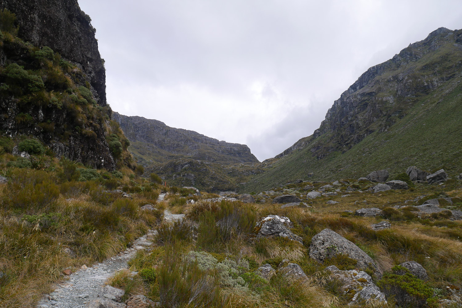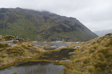 Heute Morgen ging es dann mit besserem Wetter wie erwartet los. Mich hat der andere Deutsche dann morgens mit zum Start vom Routeburn Track mitgenommen und wir sind die ersten 45 Minuten gemeinsam gelaufen, bis er gemerkt hat, dass er seine Tickets im Auto vergessen hat und noch mal zurückmusste. Den Rest der Strecke habe ich dann auch alleine genossen. Der erste Teil der Strecke war ganz einfach und fast flach. Besonders beeindruckend war das klare Wasser im Bach der neben dem Weg entlangfloss. Den letzten Teil der Strecke für den Tag geht es dann eine Stunde nur bergauf. Zwischendurch gibt es dann immer wieder eine schöne Aussicht ins Tal. Wenn man dann zur Hütte kommt, sieht man zuerst einmal die Lodge. Auf den Great Walks gibt es für geführte Touren neben den Hütten oft auch Lodges. Und die sind einfach nur mächtig und luxuriös. Dort bekommt man Essen, richtige Betten und eine warme Dusche. Dafür muss man dort für den Routeburn Track aber auch etwa 1500 $ zahlen. Ich hab nur die normale DOC Hütte gebucht und zahle nur 54 $ die Nacht. Und die Hütte ist immer noch beeindruckend groß und hat beste Lage mit einem spektakulären Ausblick von der Terrasse direkt am Abgrund. Als ich angekommen bin, war außer mir schon ein Amerikaner da und der Hut Warden hat gerade geputzt. Ich bin dann mit dem Hut Warden ins Gespräch gekommen und hab noch mal ganz neue interessante Einblicke in die Arbeit vom DOC und die Great Walks bekommen. Spannend ist zum Beispiel, dass das Ziel der Great Walks auch ist, die Leute dazu zu motivieren auch einmal andere Hüttentouren zu machen, nachdem die ersten Erfahrungen bei einem Great Walk gesammelt wurden. Mir hat der Hut Warden dann auch gleich noch gute Tipps gegeben wohin ich am Nachmittag noch laufen kann. Nach meinem Vesper bin ich dann noch mal aufgebrochen, in der Hoffnung, den Harris Sattel heute mal noch ohne Regen zu sehen und ein paar schöne Aussichten zu genießen. Auf dem Weg hab ich dann auch wieder den deutschen getroffen. Ich bin dann aber nachdem es zugezogen ist und angefangen hat zu regnen doch noch vor dem Sattel umgekehrt und hab lieber noch die Bergseen besucht. Da hab ich dann auch schöne Aussichten in das Tal gehabt. Den Abend hab ich dann gemütlich im großen Aufenthaltsraum verbracht und mich gut mit dem Amerikaner unterhalten. Der Hut Warden hat mir dann noch ein Buch und eine Zeitschrift ausgeliehen mit guten Tour Empfehlungen für mich. Ein richtig cooler Typ.
