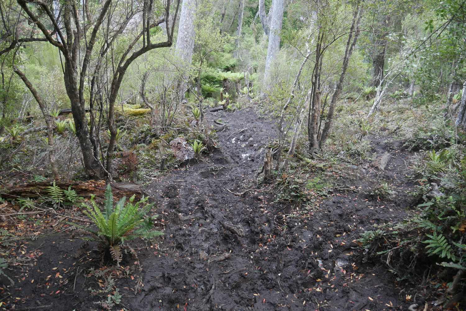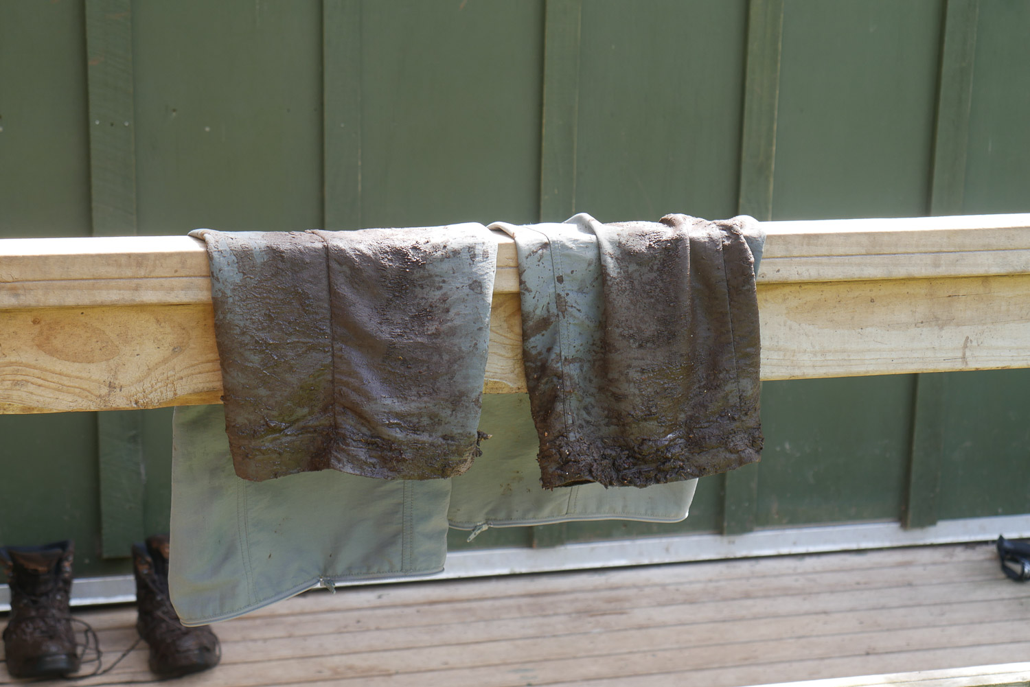 In der Nacht hat es zwar zwischendurch auch mal geregnet, am Morgen war dann aber wieder blauer Himmel und Sonnenschein. Ich habe mir mit dem Frühstück und dem Zusammenpacken Zeit gelassen und den Tag langsam angehen lassen. Heute ging es dann fast 4 Stunden durch den Wald auf die andere Seite der Insel. Dass es hier ziemlich viel regnet, kann man sich bei dem vielen Grün im Wald tatsächlich gut vorstellen. Der Weg ist leider sehr schlecht gepflegt und hat ordentliche Matschstrecken zwischendurch. Dementsprechend sehen dann auch die Hose und Schuhe aus. Auf dem Weg hab ich alle überholt, die vor mir losgelaufen sind und war mal wieder der Erste in der Hütte. Den Nachmittag hab ich dann mit lesen verbracht, bevor wir gegen später wieder mit Kartenspielen angefangen haben. Heute war ziemlich cool, dass nach dem Essen alle die nicht schon ins Bett sind, sich um einen Tisch gedrängt haben und mitgespielt haben. Die Spielkarten zu kaufen hat sich definitiv gelohnt. Nachts sind wir dann wieder auf die Suche nach Kiwis gegangen. Immerhin haben wir heute welche gehört.