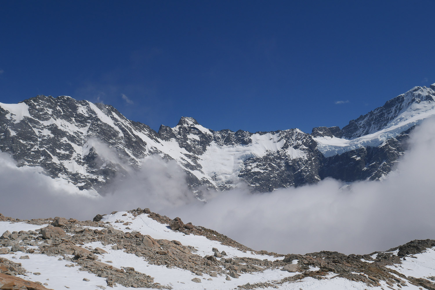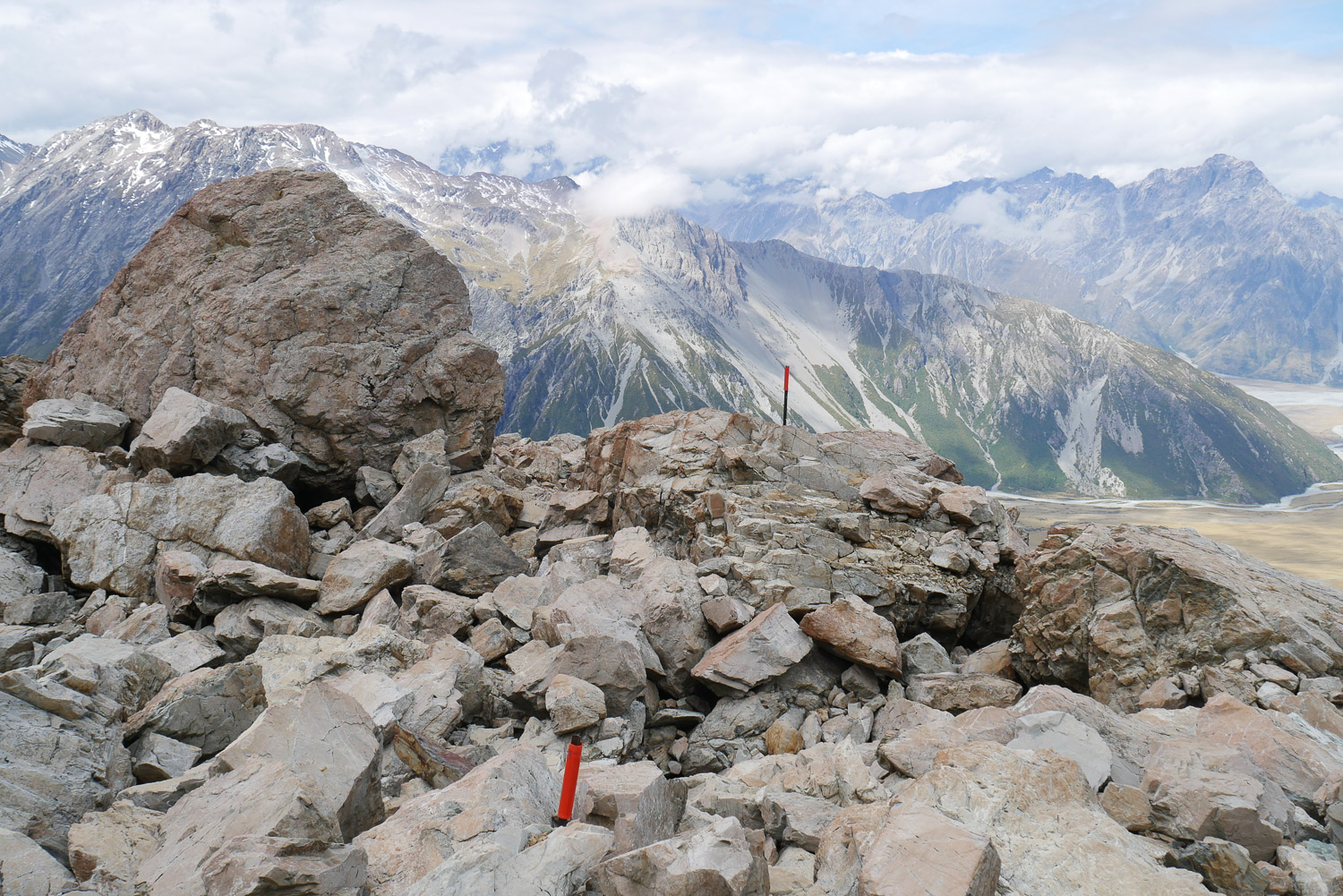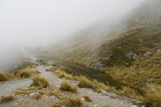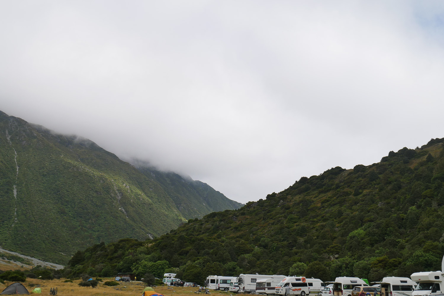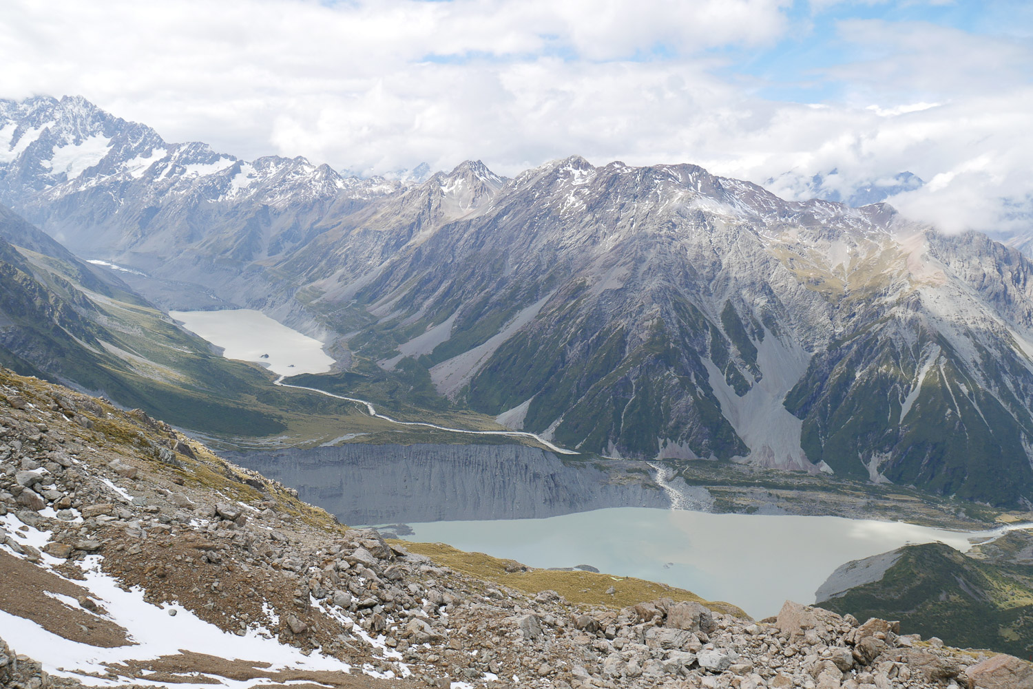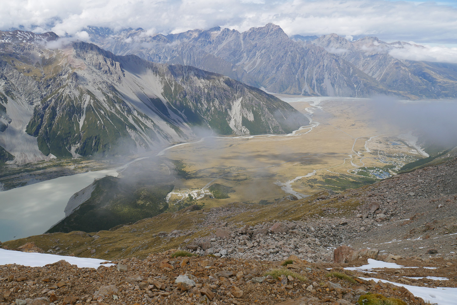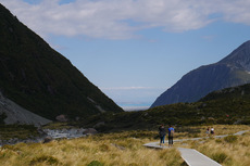 Was für eine Brühe heute Morgen mal wieder. Aber der Wetterbericht macht Hoffnung darauf, dass es am Nachmittag noch besser wird. Also Frühstücken, Rucksack packen und losgeht’s in Richtung Mueller Hut. Eigentlich hätte ich dort ja gerne übernachtet, aber die Hütte ist für den ganzen Monat schon ausgebucht. Die Beschreibung vom Weg habe ich zwar gelesen, aber trotzdem hatte ich nicht mit dem Weg gerechnet, der mich erwartet hat. Für den ersten Teil geht es über 2000 Stufen nach oben. Das ist ganz schön anstrengend. Aussicht gibt es noch überhaupt keine. Ab und zu reicht es gerade mal für 50 Meter. Der nächste Teil geht dann über Geröllfelder. Das finde ich jetzt nicht mehr ganz so anstrengend, dafür ist es technisch herausfordernder. Je höher man kommt, desto deprimierter wird man, da man immer noch keine Sonne sehen kann. Dann auf einmal war da ein kleines Loch in den Wolken und man hat das erste Mal den Himmel sehen können. Das hat dann die nötige Motivation geben den restlichen Weg vollends hochzulaufen. Wenn man den Aufstieg dann geschafft hat, kommt noch ein bisschen Schnee dazu bis man dann zur Hütte kommt. Auch wenn man immer wieder in dichte Wolken gehüllt ist, ist es wunderschön einfach nur auf der Bank vor der Hütte zu sitzen und zu genießen. Nach 5 Minuten kommen dann auch schon wieder die Berge raus. Ich konnte auch ein paar Lawinen beobachten. Hier fühle ich mich in den Bergen doch stark an unsere Berge erinnert. Nur, dass man hier auf der Hütte immer noch kein kühles Bier kaufen kann. Ich bin über eine Stunde auf der Bank gesessen und hab gelesen und genossen. Als dann endlich die Seite vom Abstieg auch aufgeklart ist, hab ich mich auf den Weg nach unten gemacht. Jetzt hat man endlich auch eine schöne Aussicht beim Runtergehen. Nach den Geröllfeldern wollte ich eigentlich nur eine kurze Pause machen. Dann sind aber ein Engländer und eine Deutsche gekommen und wir sind ins Gespräch gekommen. Wir sind dann noch einmal eine Stunde dort gesessen, bis wir gemeinsam den Weg nach unten vollends gelaufen sind.