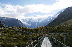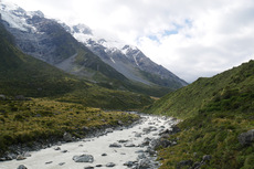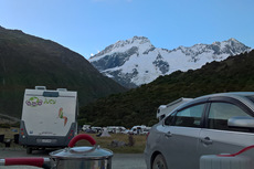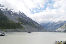Endlich mal wieder Sonnenschein am Morgen. Heute bin ich dann zum Mt. Cook gefahren. Auf dem Weg hab ich dann noch kurz in Queenstown meine Vorräte aufgefüllt und zwischendurch hab ich auch noch für einen großen Teil der Strecke einen Anhalter mitgenommen. Am Mt. Cook bin ich dann zuerst ins Visitor Center gegangen um mich nach den Touren für die nächsten Tage zu erkundigen. Aber ich muss unbedingt noch mal in das Visitor Center zurück. Da gibt es so, wie es aussieht eine spannende Ausstellung über das Bergsteigen am Mt. Cook. Am Campingplatz bin ich dann noch mal eine kleine Runde bis zu einem Gletschersee gelaufen. Zurück am Campingplatz gab es dann Abendessen und ich hab gelesen. Irgendwann haben sich dann auch die Wolken verzogen und man konnte die Berge besser sehen. Schon beeindruckend hier.