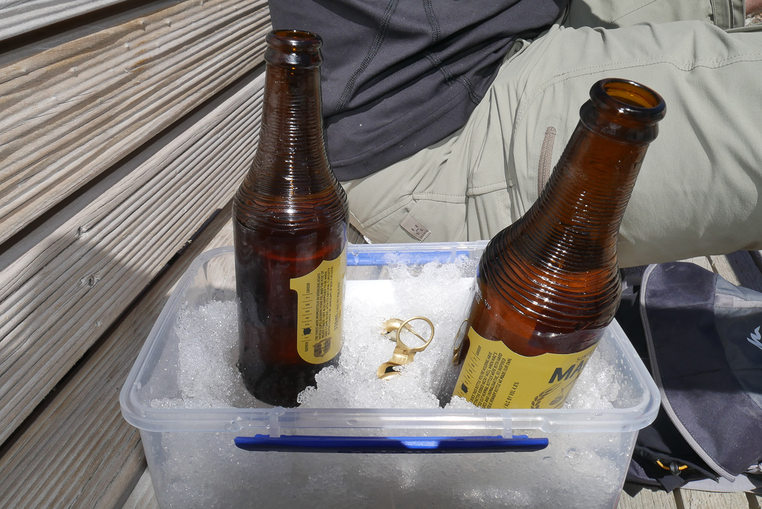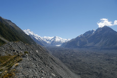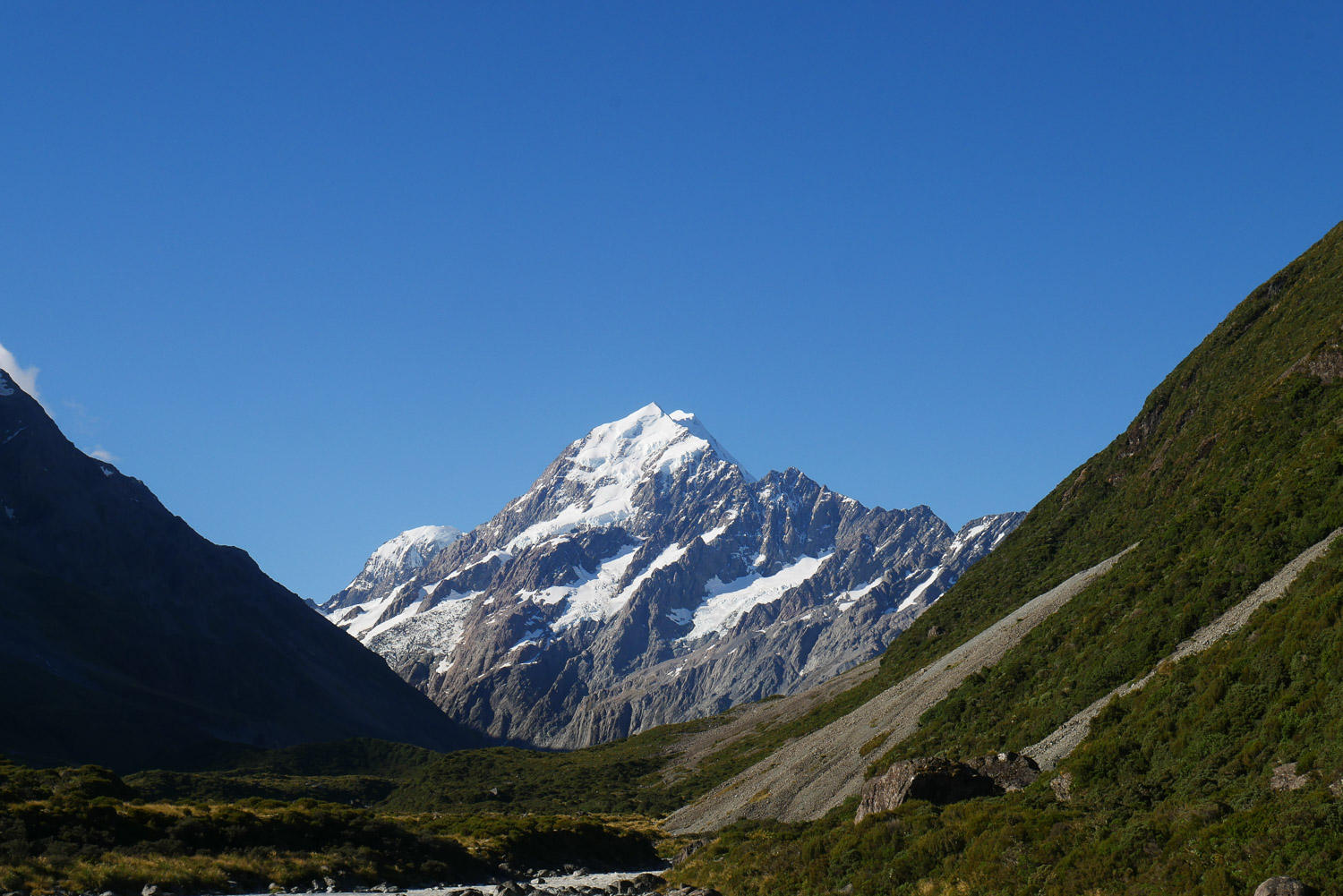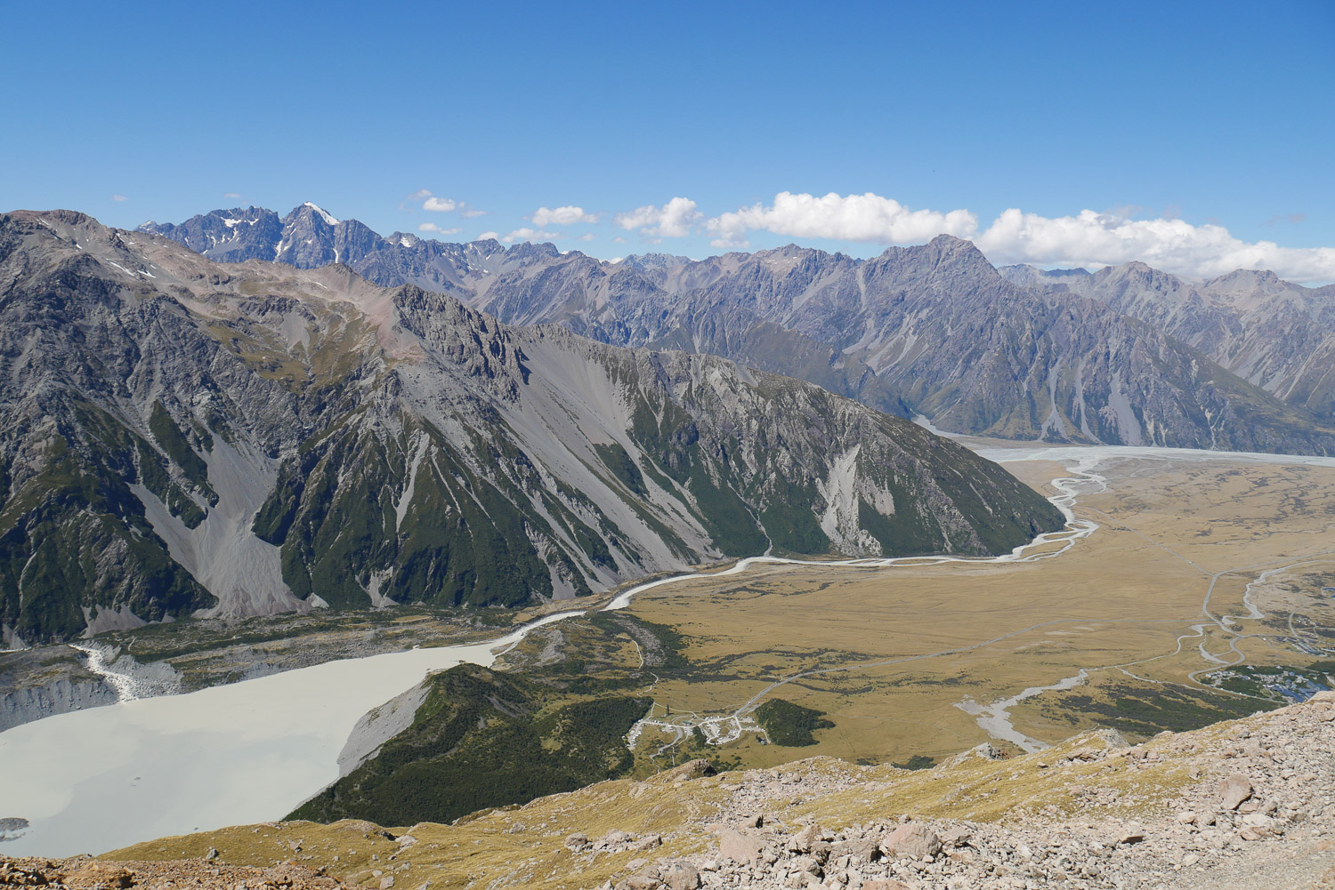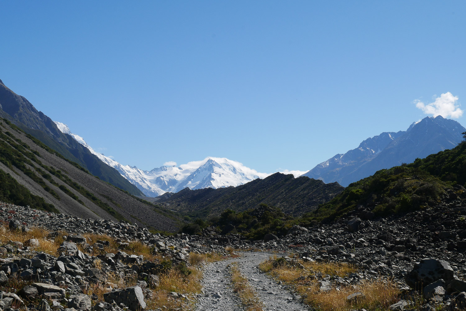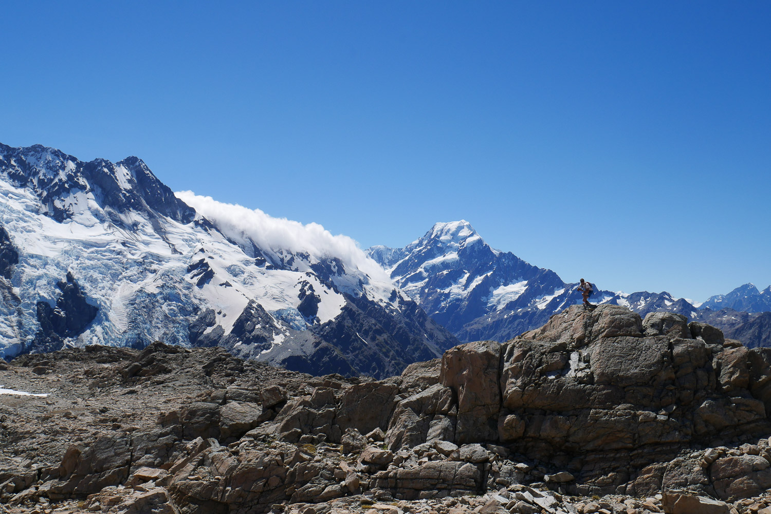 Mueller Hut die Zweite. Im Gegensatz zum letzten Mal ist schon heute Morgen ein geniales wolkenfreies Wetter. Beste Voraussetzungen für den Aufstieg. Der Weg ist mir heute dann doch um einiges leichter gefallen, da ich schon wusste was mich erwartet und wie weit es noch geht. Der Aufstieg war so ganz ohne Nebel und Wolken auch um einiges schöner. Oben auf der Hütte ist dann auch das Bergpanorama gleich noch mal schöner als beim letzten Mal. Es gibt nur deutlich weniger Schnee. Trotzdem war es aber noch genug um die Idee vom letzten Mal umzusetzen. Eisgekühltes Bier auf der Hütte. Wenn man schon kein Bier kaufen kann, muss man es halt selbst mitnehmen. Das Wetter hat auch noch beim Abstieg und den ganzen Abend gehalten und wir konnten wieder draußen kochen. Nur der Wind der immer stärker wurde, war dann recht schnell nervig.