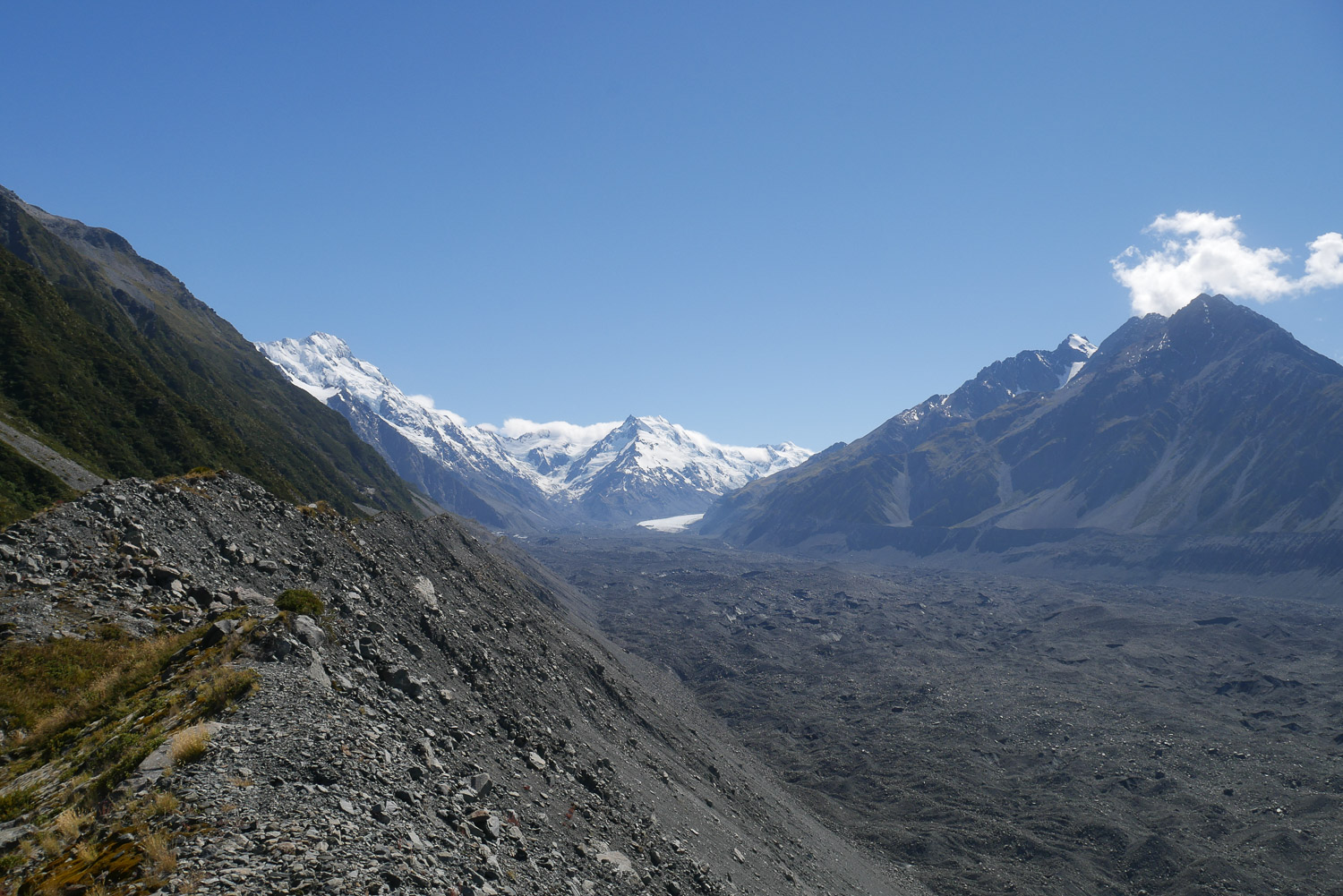 Heute wäre der Weg zu Mueller Hut sicherlich auch sehr schön gewesen. Schon morgens beim Aufstehen hat die Sonne bei blauem Himmel geschienen. Für heute hatte ich mir überlegt zur Ball Hut zu laufen. Dort soll man, wenn man auf den Grat hochläuft. Beim Parkplatz bin ich erst mal noch zu einem weiteren Gletschersee, bevor ich dann los zur Hütte bin. Die Sonne hat ohne jede Gnade vom Himmel geschienen und es war richtig heiß. Der erste Teil der Strecke geht über eine alte Allradstrecke, die recht langweilig ist. Nach einer Stunde in der knallen Sonne hatte ich dann einfach keine Lust mehr den ganzen Weg zu laufen. Spontan habe ich mich dann entschieden, den kleinen Pfad den ich entdeckt habe, auf den kleinen Grat zu gehen. Ich bin dann direkt über dem Ende vom Gletscher rausgekommen und man hatte eine echt schöne Aussicht. So nah kommt man vermutlich nicht so einfach zu Fuß an den Gletscher. Auch wenn mich Gletscher nicht ganz so beeindrucken, war es trotzdem schön dort auf dem Grat mein Vesper zu Essen. Danach bin ich dann zum Auto und direkt zum nächsten Campingplatz, den ich schon rausgesucht hatte gefahren. Dort dann erst mal wieder eine Dusche genießen. Am Abend hab ich dann noch meinen Newsletter geschrieben und dank kostenlosem Internet einfach mal wieder nur im Internet rumgestöbert.