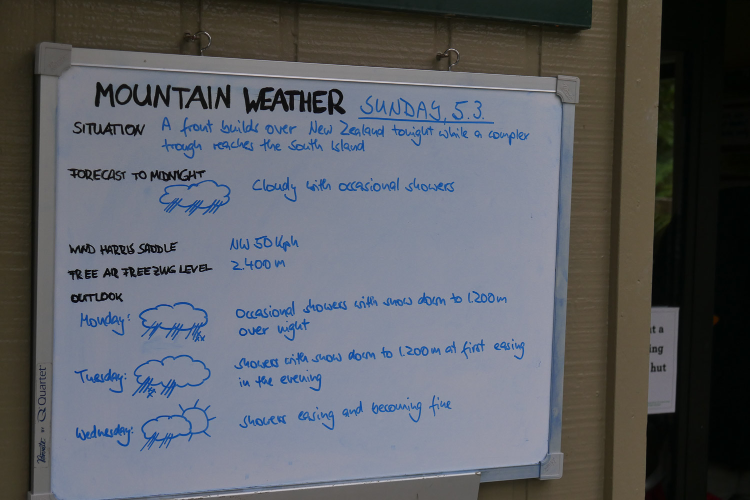 Heute ist der Tag der Tage. Wir laufen fast den ganzen Routeburn Track von der Howden Hut bis zur Flats Hut. Ein bisschen weiter als beim letzten Mal. Der Wetterbericht ist auch etwas besser als beim letzten Mal. Immerhin soll es nur kurze Schauer geben. Morgens beim Aufstehen sah es erst mal mit dem dicken Nebel gar nicht gut aus. Es war dann den Tag über zwar immer noch kein Traumwetter, aber es hat immerhin nicht geregnet und man konnte schon mal deutlich mehr sehen. Zwischendurch hat man sogar blauen Himmel gesehen. Die krassen Aussichten sind auf dem ersten Teil der Strecke immer noch weggefallen, aber nach dem Sattel hatte man immerhin bis nach unten zur Hütte eine schöne Aussicht ins Tal. Auf dem Weg nach unten sind wir dann zuerst bei einem Ranger, der am Weg gearbeitet hat, hängen geblieben. Wir haben uns eine ganze Weile gut unterhalten. Als wir dann endlich weiter gekommen sind, sind wir auch gleich wieder bei einem Kanadier hängen geblieben und hatten noch mal ein gutes Gespräch. Danach gab’s dann nur noch eine kurze Pause in der Falls Hut, bevor es dann vollends zu unserer Hütte für die Nacht ging. Wir haben etwas unter 8 Stunden gebraucht. Eine ganz gute Zeit mit den ganzen Pausen zwischendurch. Die Hütte ist ganz schön und hat eine große Fensterfront mit einer schönen Sicht. Nur waren die Leute in der Hütte heute nicht ganz so interessant. Über die Hälfte waren Asiaten, die schon um 8e im Bett waren. Wir haben uns dann mit einem anderen Deutschen den Abend über unterhalten. Er hat seinen Master in Physik gemacht und bevor er mit dem Doktor anfängt, ist er noch für 3 Monate nach Neuseeland. Die Hut Wardin war auch ganz nett, aber auch nur kurz für einen Hut Talk da.